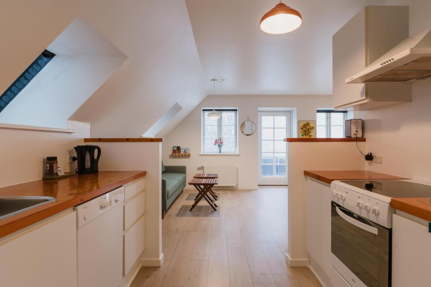 Studio with Shared Bathroom. Brightly decorated apartment with a sofa, dining table and a kitchen with a stove, fridge and dishwasher. Bathroom facilities are shared. ;